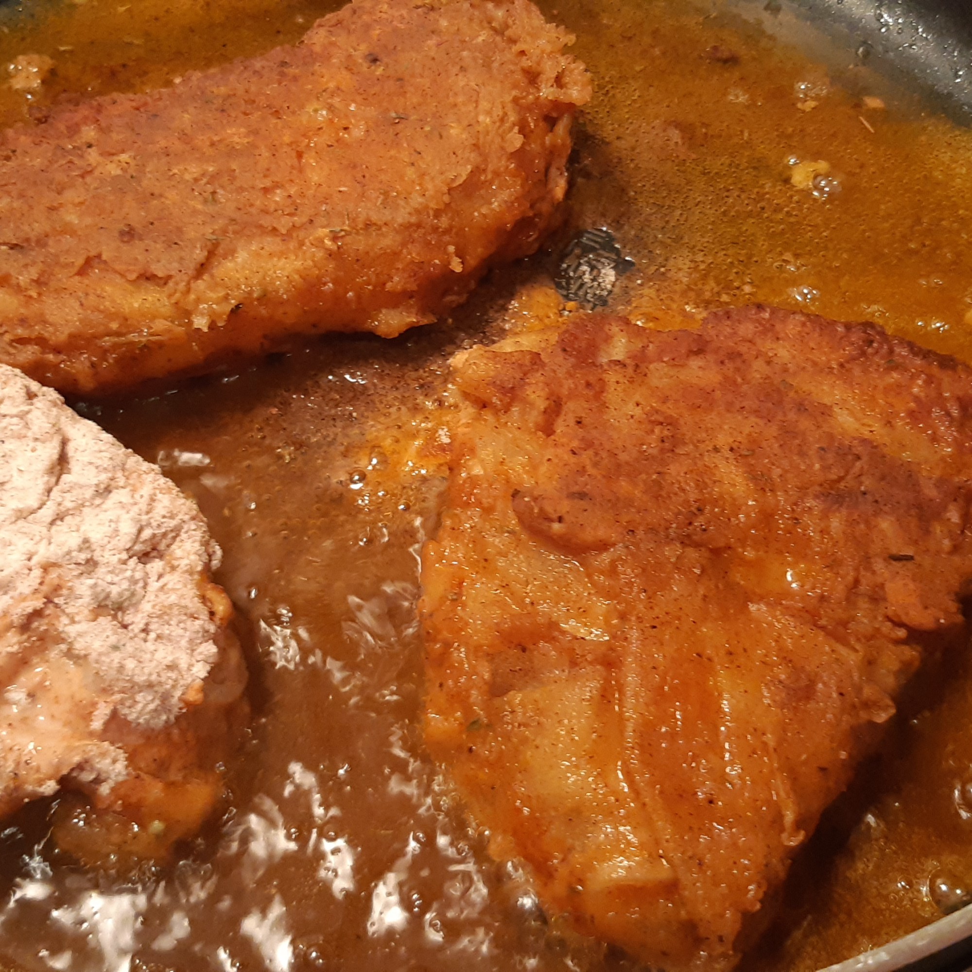 - Place each patty, one by one, in the flour (mixed with spices) and coat well. Dredge the patty through the sauce (hot sauce, milk) then coat one more time in the flour.