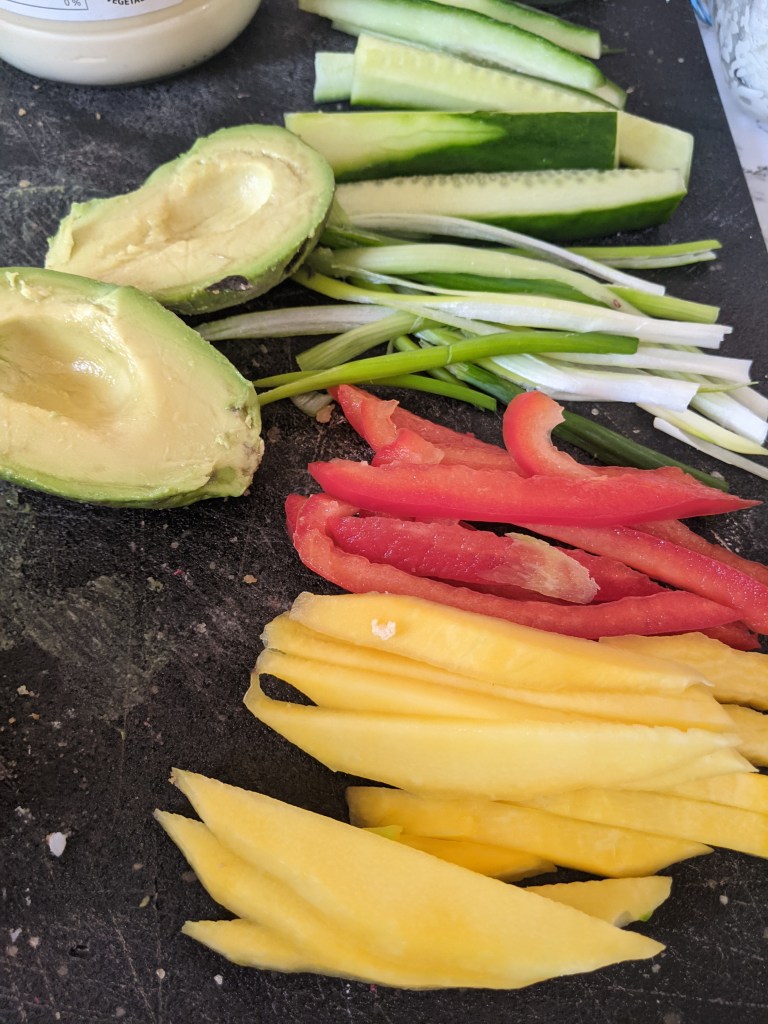 Here are the fresh ingredients I used: avocado, cucumber, green onions, red pepper and mango. I used Farm Boy’s vegan mayo and mixed with some Siracha (make sure you get a vegan one!). And lastly, I used cut up oyster mushrooms, dusted in cornstarch and lightly fried in canola oil. I added HOISIN sauce to the one with mushrooms to give it a different flavour – but realize that’s been left out of this recipe card!!! The rest of the ingredients and directions are below! On with the show!