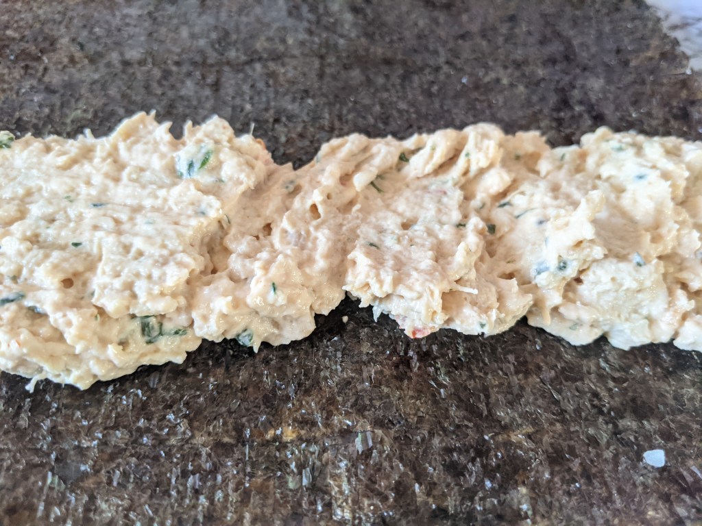 Okay, before you get to the recipe, I’m going to let you in on my little secret ingredient……the vegan crab! I love creating vegan alternatives using plants, but this time, in my dream, I came up with the perfect vegan hack! Gardein crab cakes!!!!!!! EEEEK brilliance! However, they are breaded and I’m currently trying my best to avoid gluten – so…..these are definitely NOT gluten free, but I did the best I could at removing the breading! I let the crab cakes thaw in the fridge during the day, then peeled off the breading and placed the ‘crab’ mixture into a bowl and mashed it up with a fork. AHHHH. It was such a brilliant idea, I’m still patting myself on the back! Check it out!