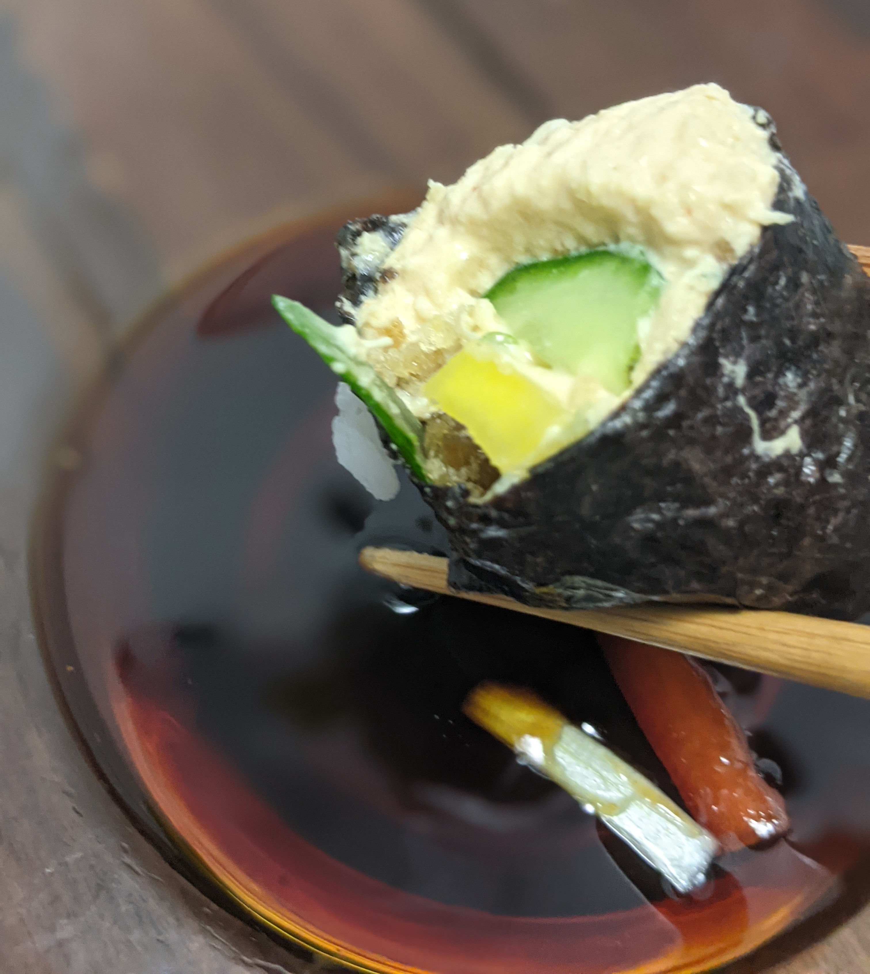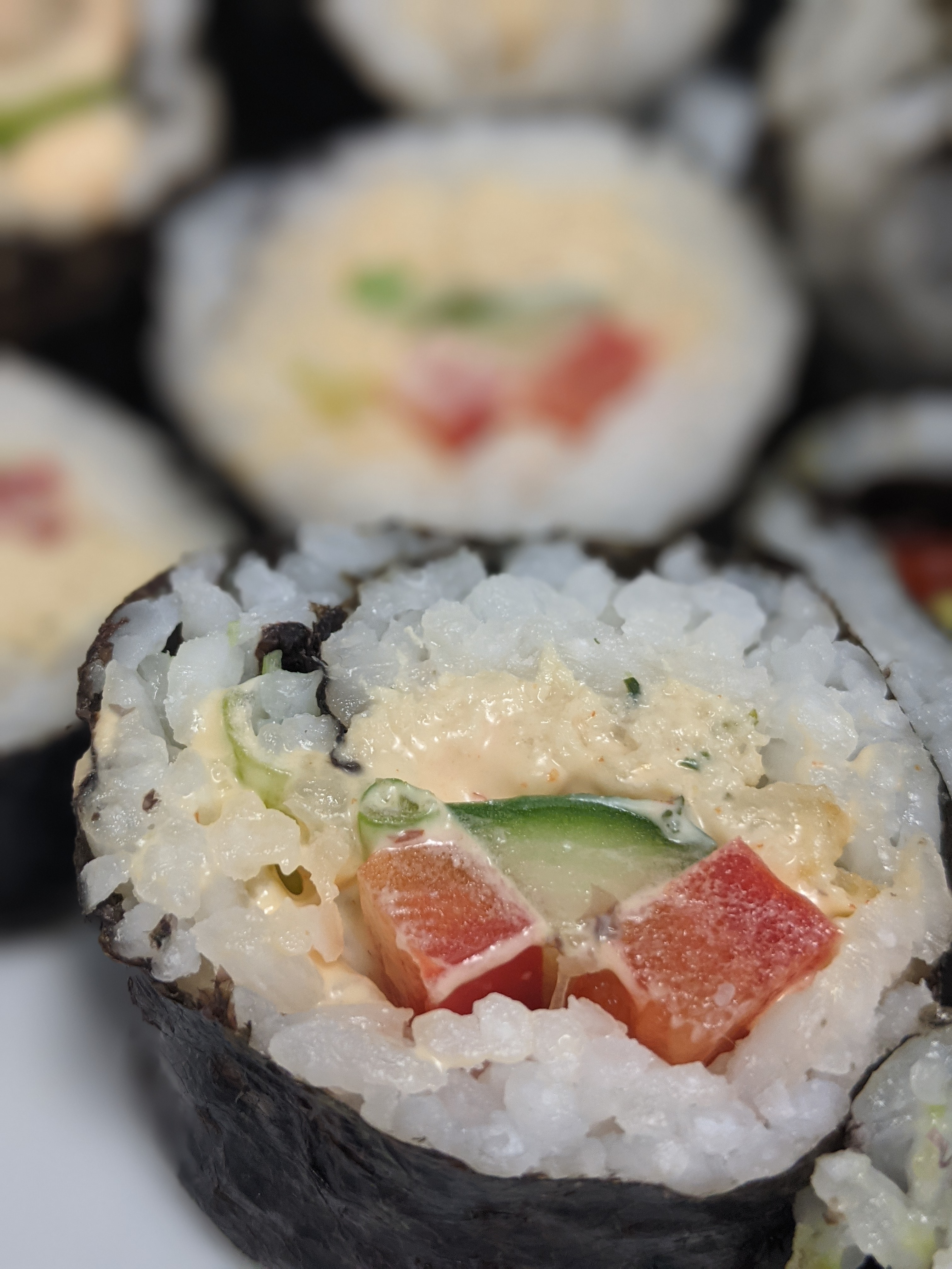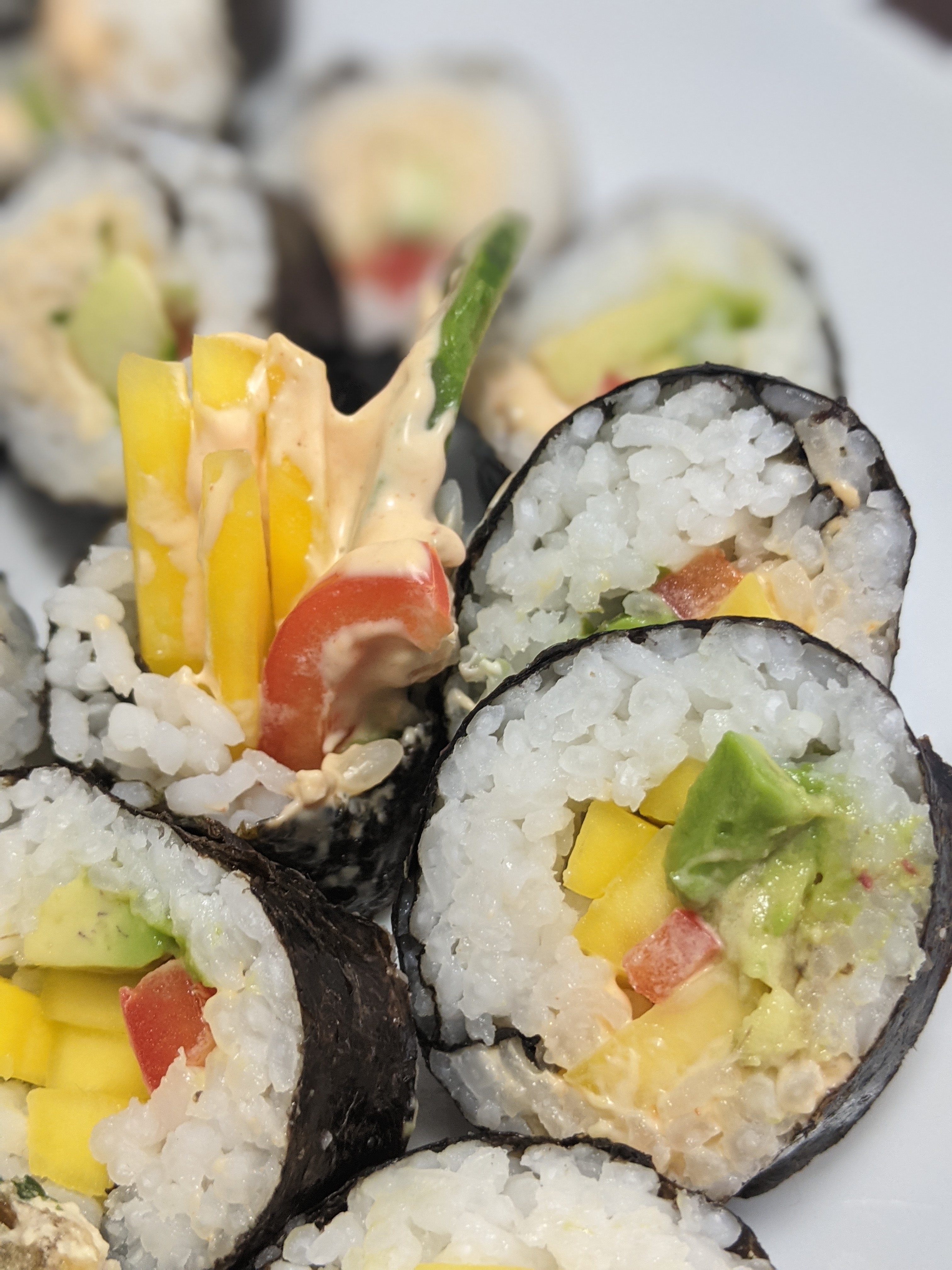 The flavour profiles of sushi are very important. As each bite contains a mixture of ingredients, you want each bit to taste fresh and bring a party to your mouth! Teriyaki, spicy mayo, yuzu, miso and more are all traditional sushi flavours, so trying to match these the best you can if you are going for more traditional rolls. To keep things fresh tasting, you’ll want to use ingredients like mango, avocado, cucumber and green onions. To add a kick, you can whip up a quick vegan spicy mayo. To add a crunch, you can add some tempura flakes, quick fry some mushrooms, or even use some crispy onions. The combinations are endless. So without further ado, here are the few that I made recently. They do use similar ingredients, as I was just cooking for one – but I did share some of them with my neighbour – who confirmed they tasted delicious!! Enjoy!