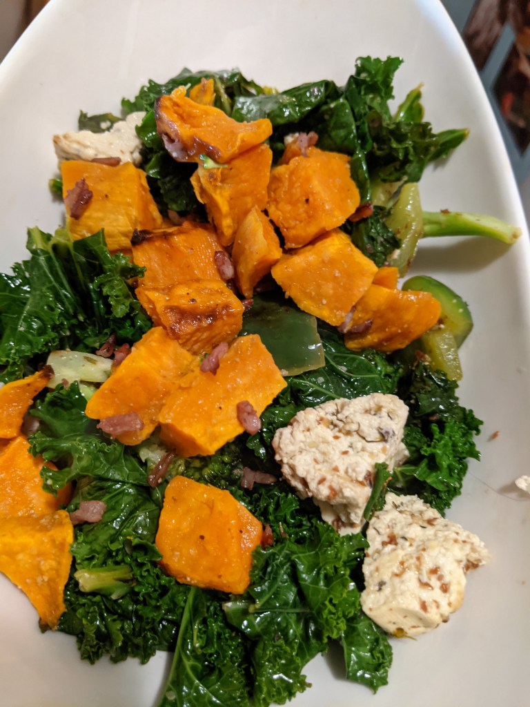Next I used the roasted sweet potatoes I made the day before for another dish, so of course I had to add them here because – sweet potatoes are yum! These were oven roasted, with a sprinkle of sesame oil and some pink Himalayan salt. Peeled and cut into cubes, you roast them for 25 to 30 minutes at 400F and they are ready to go!