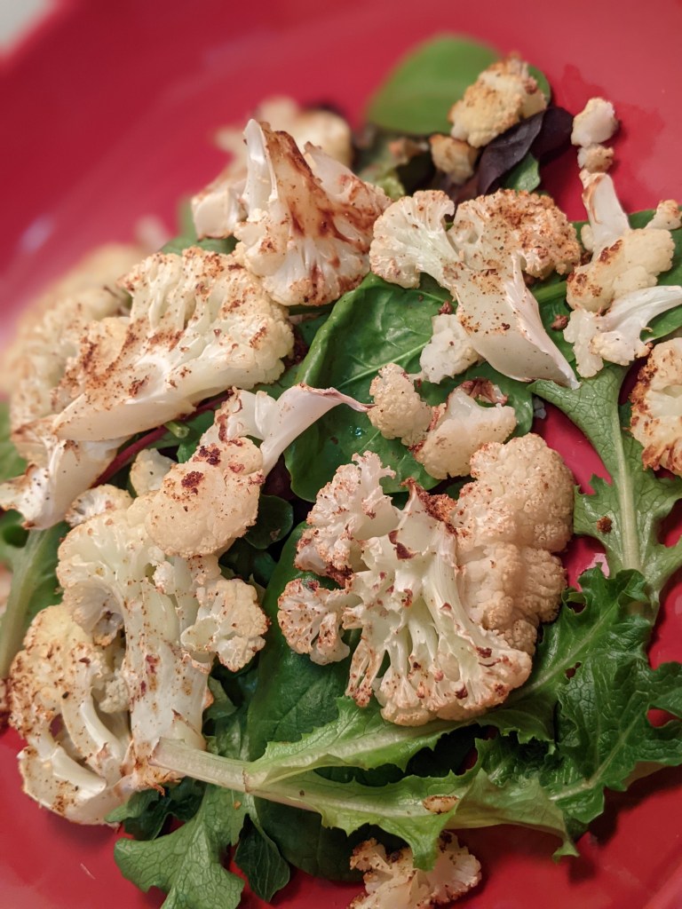 So even though I have a giant bag of red corn tortilla chips I decided to use up the last of my cauliflower and sliced it into flat florets and even though I still had to eat it with a fork because it’s a bit difficult to pick up pieces of roasted cauliflower with toppings on it without it falling into your lap, I’m still calling these nachos!!!!!