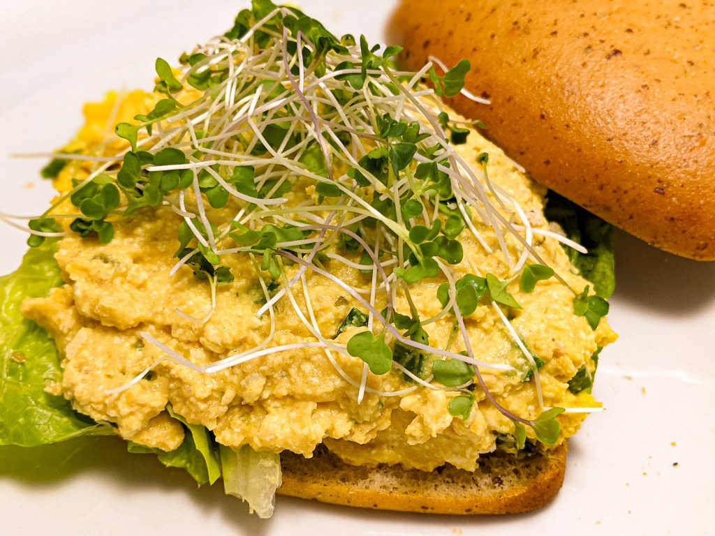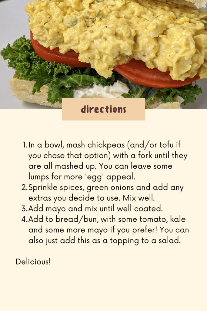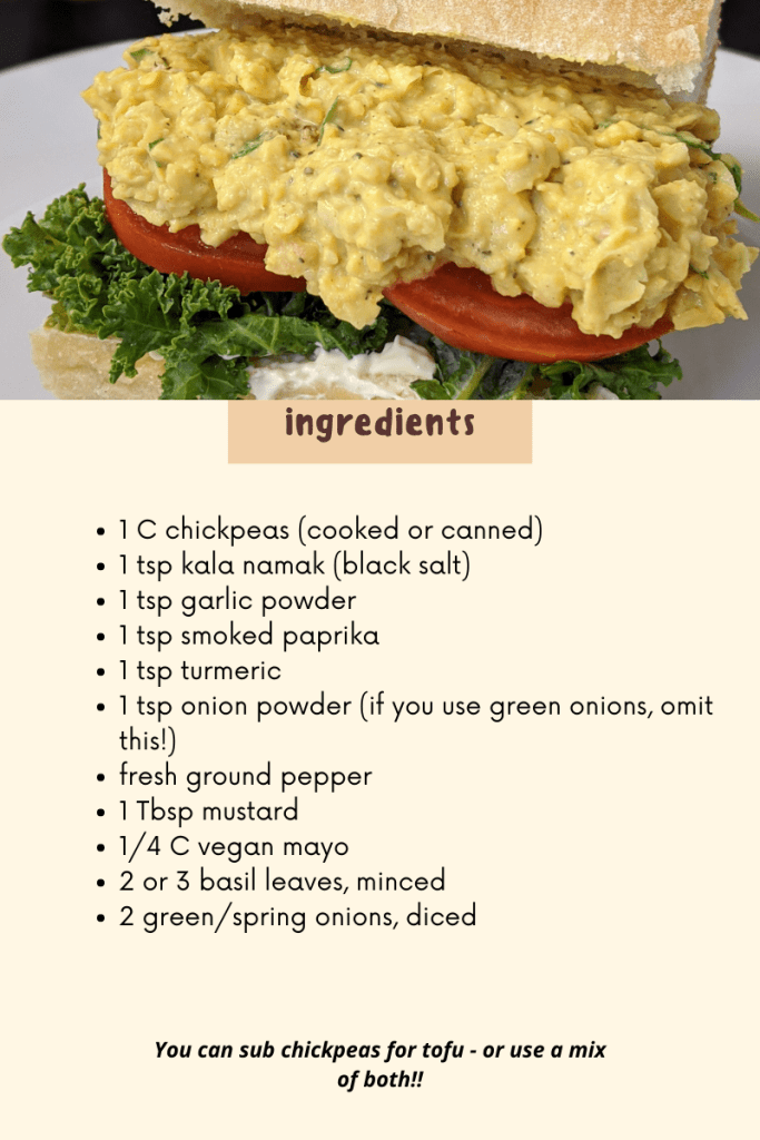 Sharing is caring – so here’s one of my faves! Eggless salad made out of….chickpeas! You can use tofu in place of chickpeas if you prefer!! (just press and drain, then use the same way).