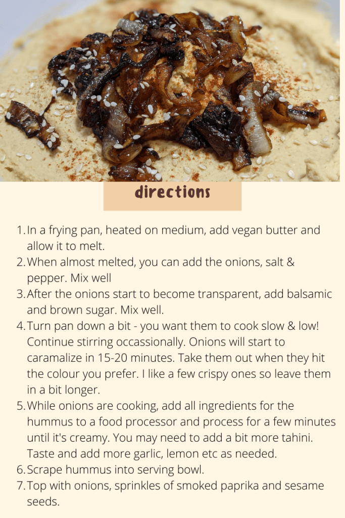 Hey there! You know what I was thinking the other day? That I’ve been making this basic hummus recipe for YEARS and I’ve never shared it anywhere! I try to make this often as it’s a great snack with some veggies or crackers and is an amazing source of protein! I had set out to make a Roasted red pepper hummus, but realized I didn’t have any red peppers left (shocking!), so with a last minute decision, I went with caramelized onions. And I do not regret it IN THE LEAST as it is truly delicious!