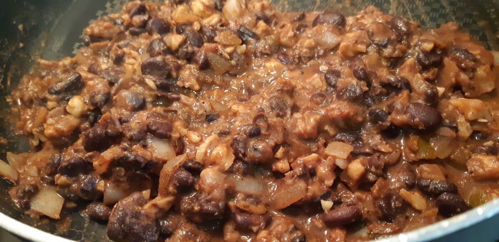 - Add lentils, beans, walnuts and salsa (or broth/water). Mix and cook another 4-5 minutes, stirring. Use a potato masher and mash up the beans/lentils so it starts to look more, well, “meaty”. It just holds together better!